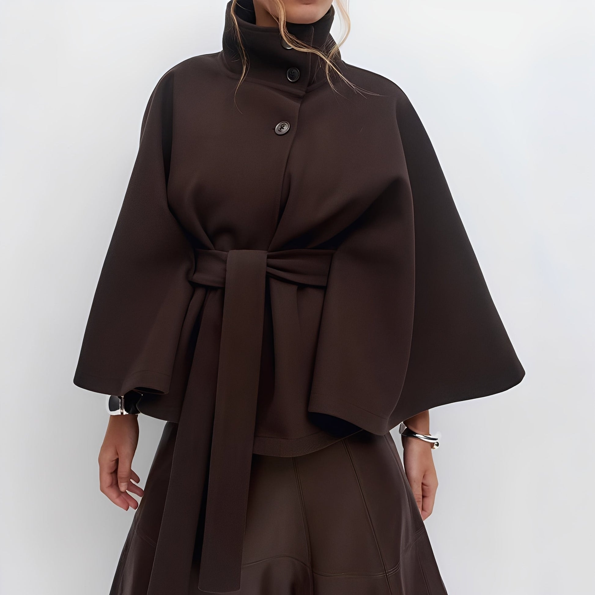 - Guler înalt elegant și mâneci largi care îmbogățesc stilul fără efort