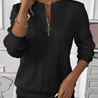 Puloverul Davida este realizat dintr-un amestec de fire plăcut moale și oferă, datorită fermoarului frontal practic, ventilație flexibilă și ajustare individuală. Aspectul ușor matlasat conferă designului structură și o notă modernă, feminină. Cu croiala sa flexibilă, este ideal pentru viața de zi cu zi, birou sau weekenduri relaxante – un pulover care îmbină armonios confortul și stilul.