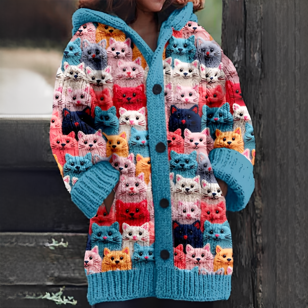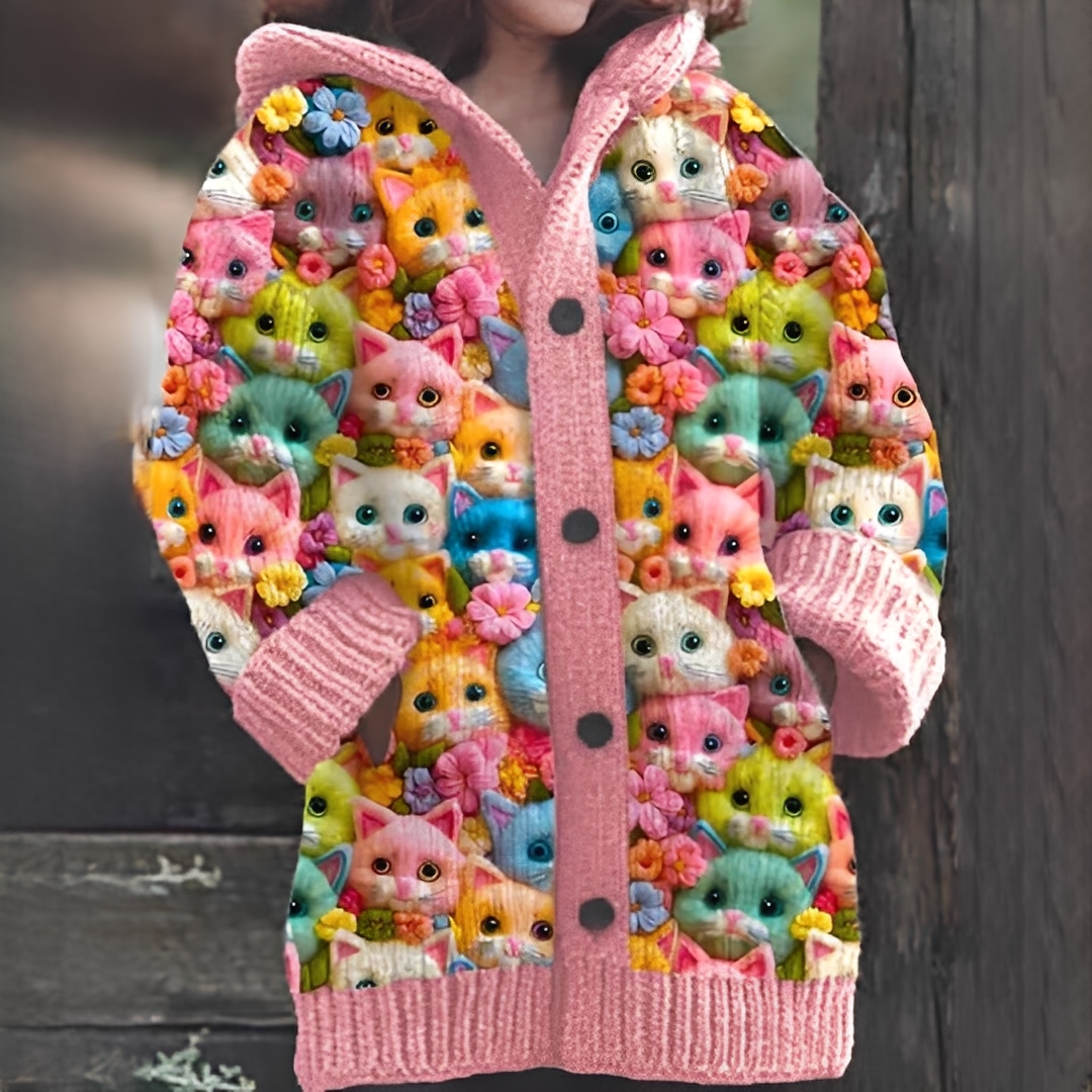 Un cardigan pentru femei cu imprimeu de pisică, oferind căldură, stil și șarm zilnic.